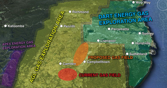 2) Dart Energy’s exploration area covers the rest of the Sydney Metropolitan Area. Dart planned to drill a gas well in the inner city suburb of St Peters, but were vigorously opposed by local residents.